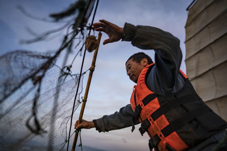 Fisherman Zhang Kaidi catches fish on Dianchi Lake in Kunming, southwest China's Yunnan Province, Oct. 22, 2019. (Xinhua/Jiang Wenyao)