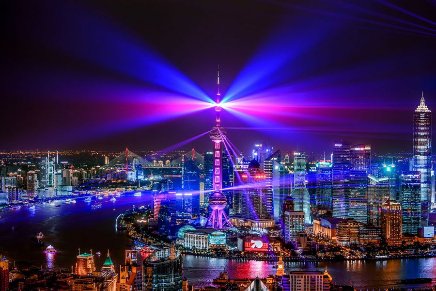 A light show is seen along the Huangpu River in Shanghai, east China, Sept. 18, 2019. (Xinhua/Ren Long)