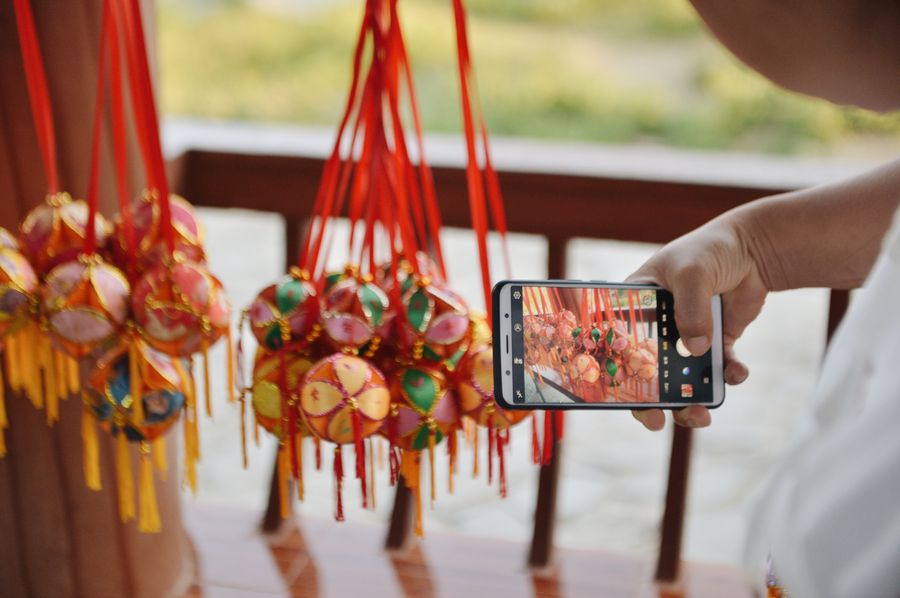 A tourist takes a picture of embroidered balls in Jiuzhou ancient town of Jingxi City, Nov. 4, 2019. (Xinhua/Cui Bowen)