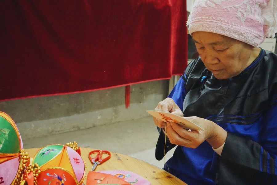 Craftswoman Huang Xiaoqin makes an embroidered ball in Jiuzhou ancient town of Jingxi City, Nov. 4, 2019. (Xinhua/Cui Bowen)