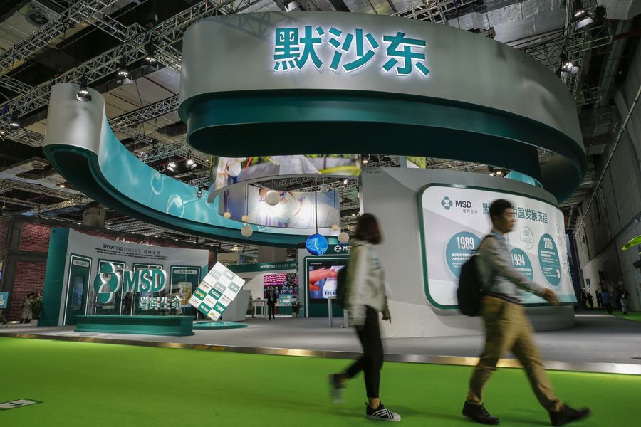 Visitors walk past the booth of MSD during the second China International Import Expo (CIIE) in Shanghai, east China. (Xinhua/Zhang Yuwei)■