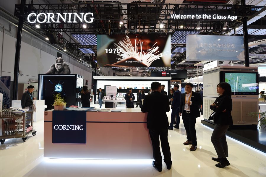 People visit the booth of Corning Incorporated during the second China International Import Expo (CIIE) in Shanghai, east China. (Xinhua/Fan Peishen)