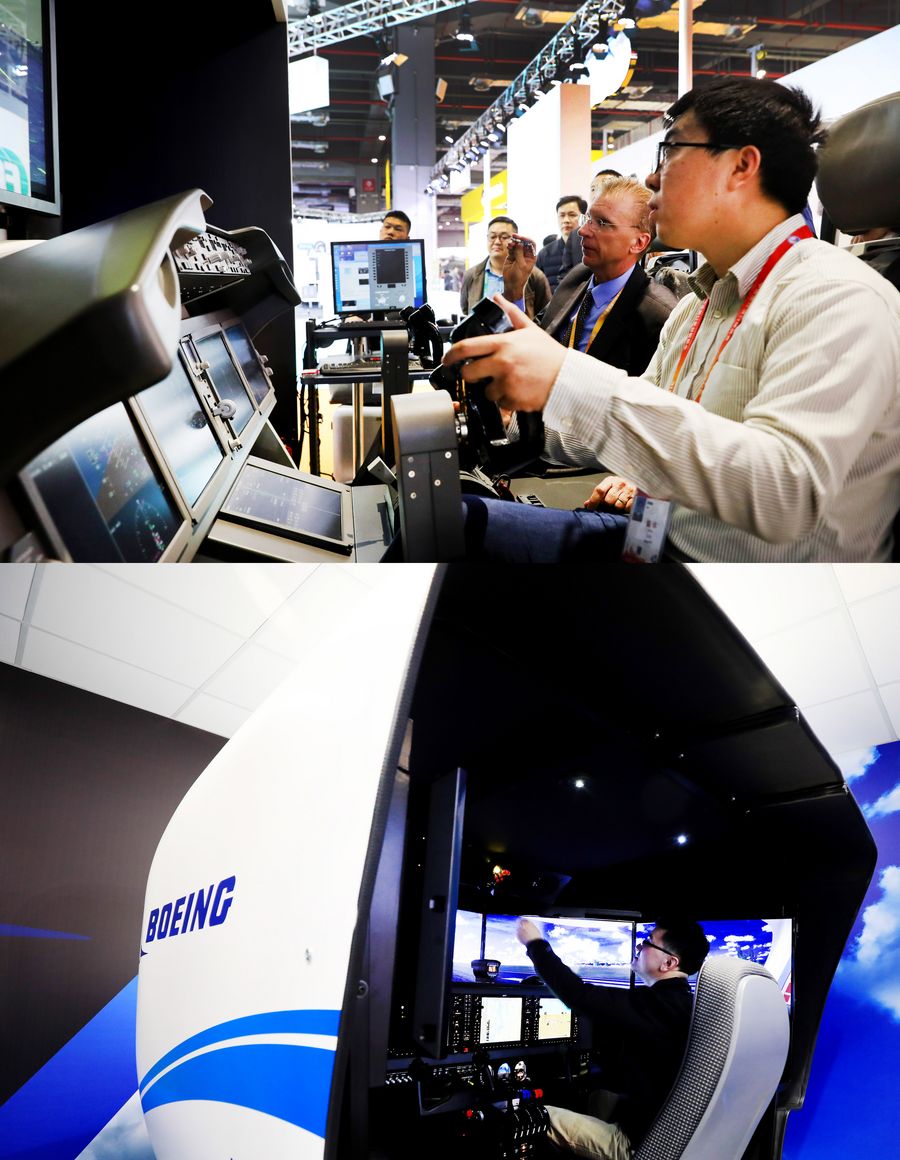 Combo photo shows a visitor experiencing Boeing 787 flight simulator at the first China International Import Expo (CIIE) in Shanghai, east China, Nov. 5, 2018 (top), and a Boeing flight simulator during the second CIIE, Nov. 8, 2019 (bottom). (Xinhua/Fang Zhe)