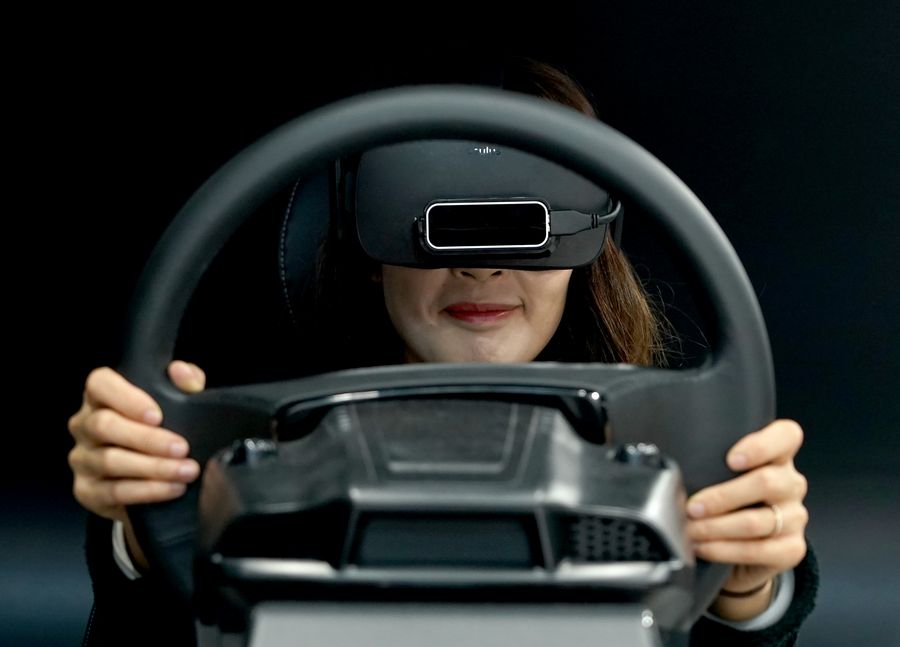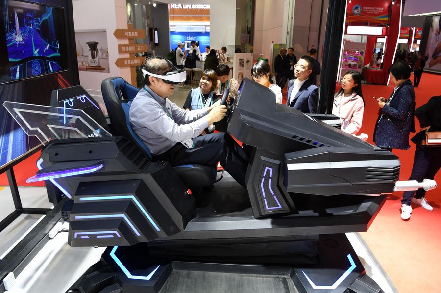 A visitor experiences a VR racing simulator at the Sci-tech Life exhibition area during the second China International Import Expo (CIIE) in Shanghai, east China. (Xinhua/Fan Peishen)