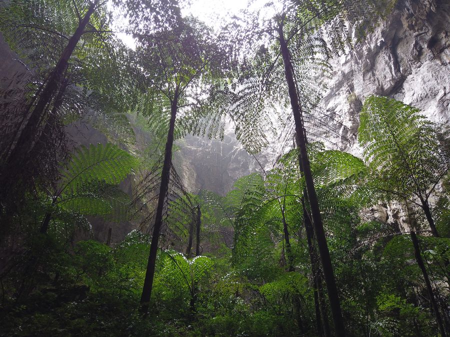 A cave expedition member stands among trees at the bottom of Nongyang Tiankeng (an area of naturally formed pits) in Napo County, south China's Guangxi Zhuang Autonomous Region, Nov. 2, 2019.