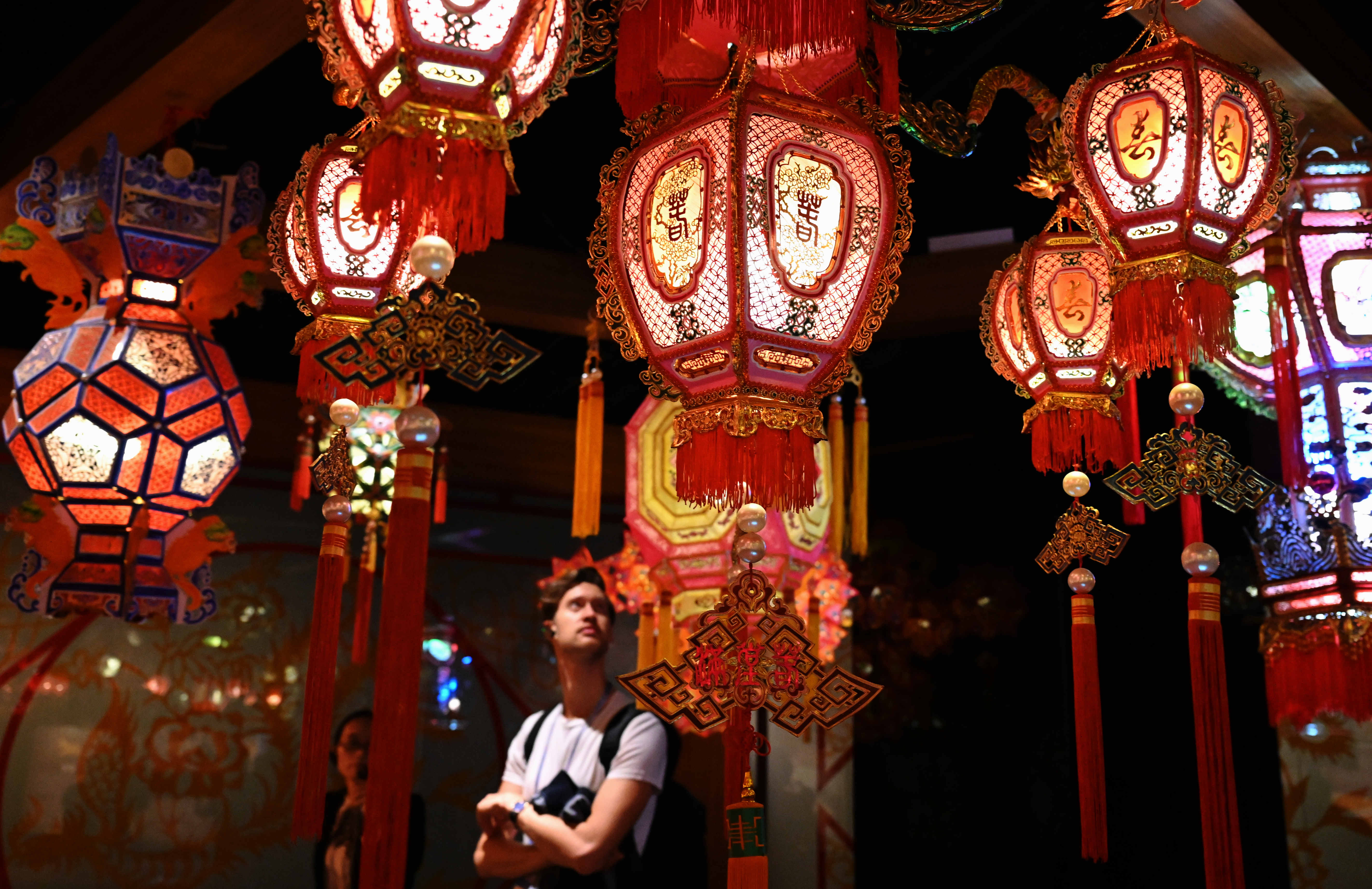 A visitor looks at Quanzhou-style lanterns during an exhibition on intangible cultural heritages along the ancient Maritime Silk Road in Quanzhou, southeast China's Fujian Province, Nov. 23, 2019. (Xinhua/Wei Peiquan)