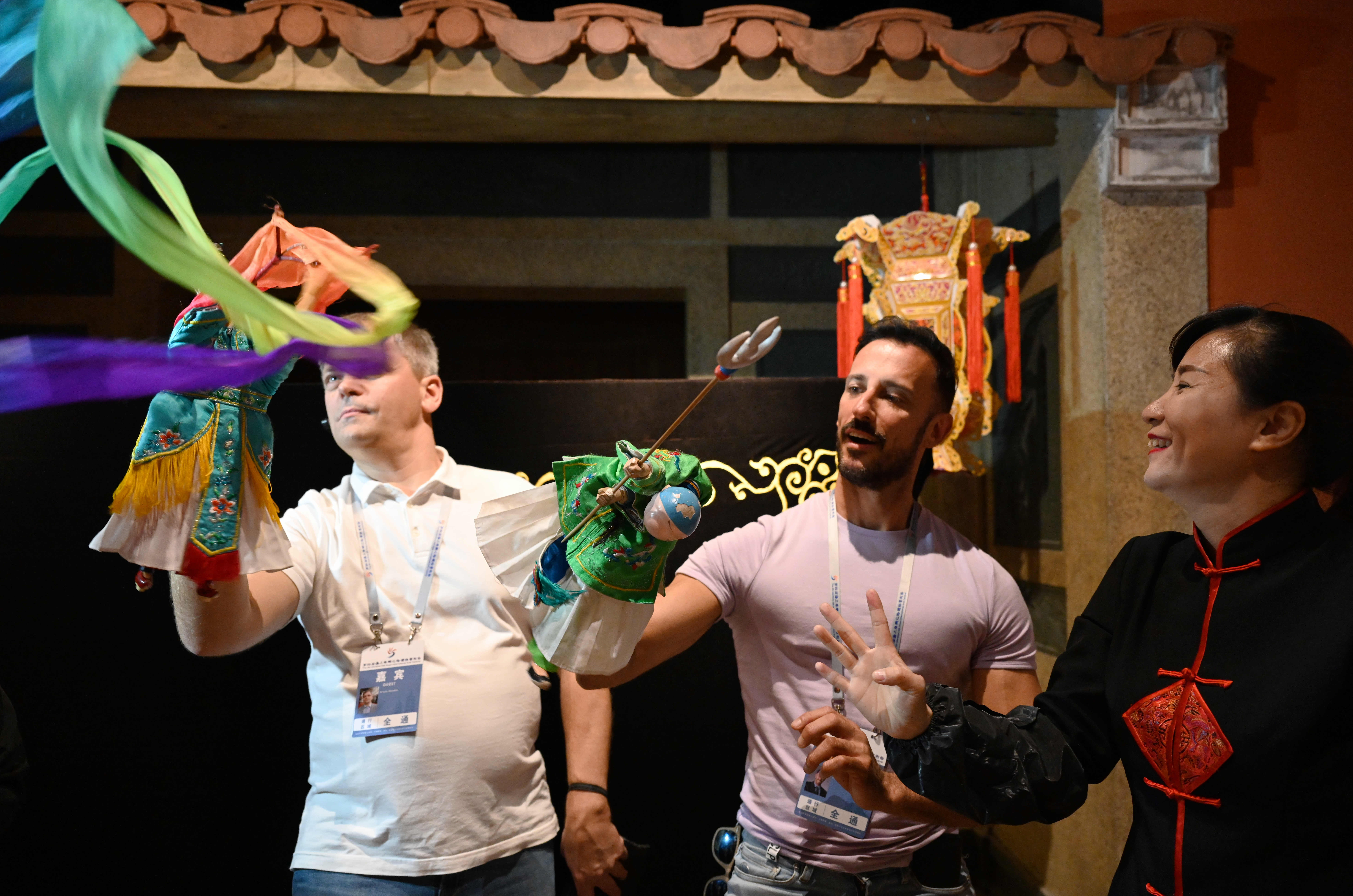 Joseph Charles Chetcuti (C) from Malta and his friend learn to manipulate puppets used in a Quanzhou glove puppetry during an exhibition on intangible cultural heritages along the ancient Maritime Silk Road in Quanzhou, southeast China's Fujian Province, Nov. 23, 2019. (Xinhua/Wei Peiquan)