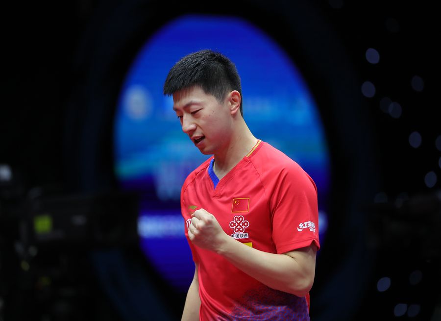 Ma Long of China celebrates during the men's singles quarterfinal match against Dimitrij Ovtcharov of Germany at the 2019 ITTF Men's World Cup in Chengdu, southwest China's Sichuan province, Nov. 30, 2019. (Xinhua/Wang Dongzhen)