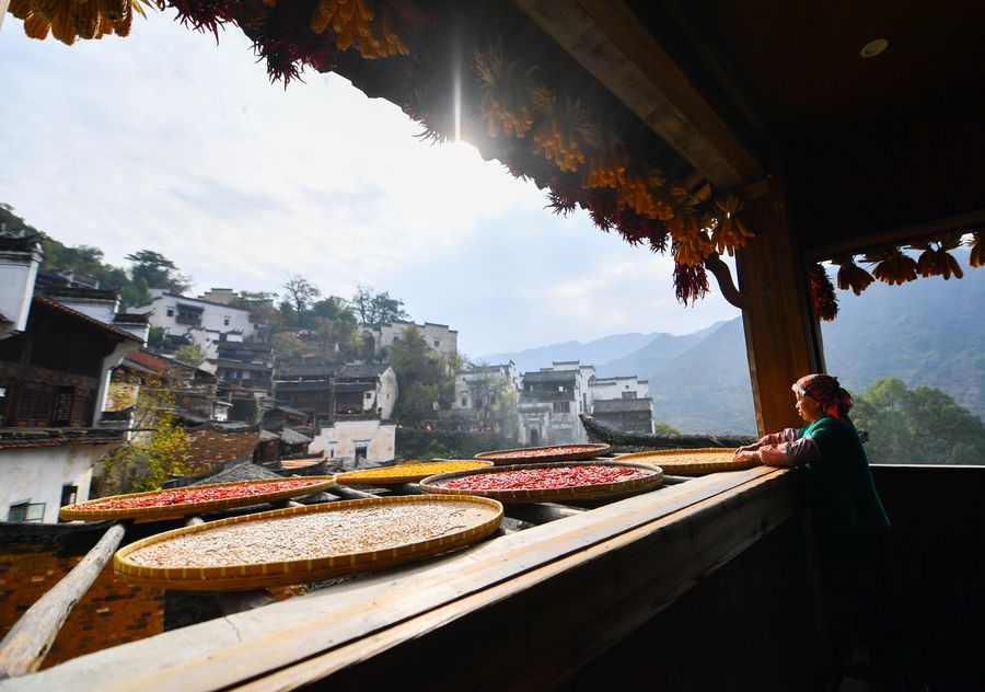 A woman dries farm products in Huangling Village of Wuyuan County, east China's Jiangxi Province, Nov. 7, 2019. (Xinhua/Hu Chenhuan)