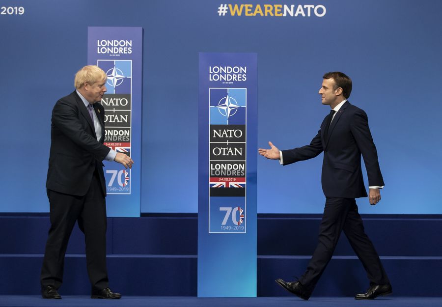 British Prime Minister Boris Johnson (L) welcomes French President Emmanuel Macron at the official arrivals for NATO (North Atlantic Treaty Organisation) Summit in London, Britain on Dec. 4, 2019. (Xinhua/Han Yan)