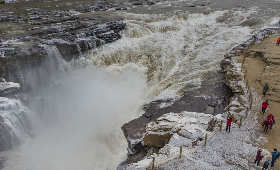 Tourists visit the Hukou Waterfall scenic spot, Dec. 14, 2019. (Xinhua/Tao Ming)