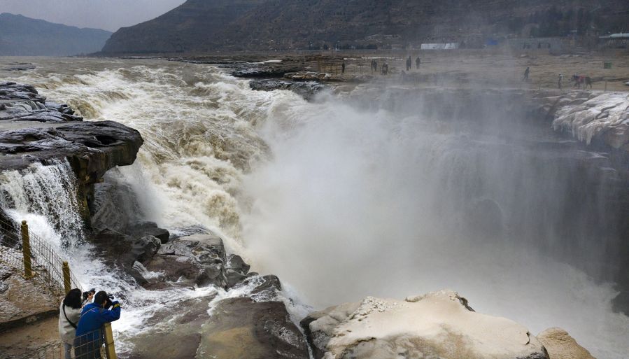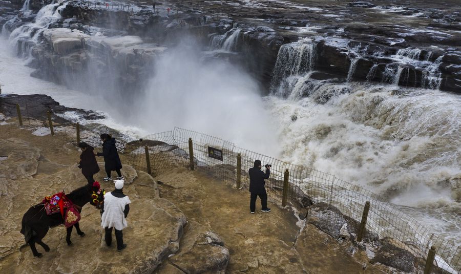 Tourists take photos at the Hukou Waterfall scenic spot, Dec. 14, 2019. (Xinhua/Tao Ming)