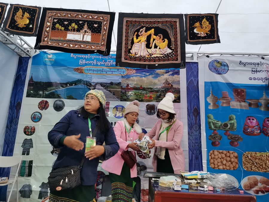 Myanmar exhibitor Thet Thet Naing (1st L) showcases her country's best handicrafts at a border trade fair in the southwestern Chinese city of Ruili, Dec.10, 2019. (Xinhua/Yao Bing)