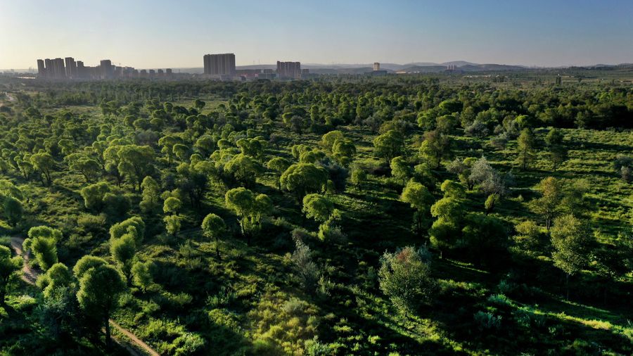 Aerial photo taken on Aug. 16, 2019 shows the scenery at a wetland near Jingbian County in Yulin City, northwest China's Shaanxi Province. The outskirt of Jingbian County, once a barren land on the verge of the Maowusu Desert in the 1960s, has witnessed increasing forest area thanks to decades of hard afforestation efforts. The county now has achieved a 38-percent forest coverage and its downtown area boasted a 40-percent green coverage. (Xinhua/Tao Ming)