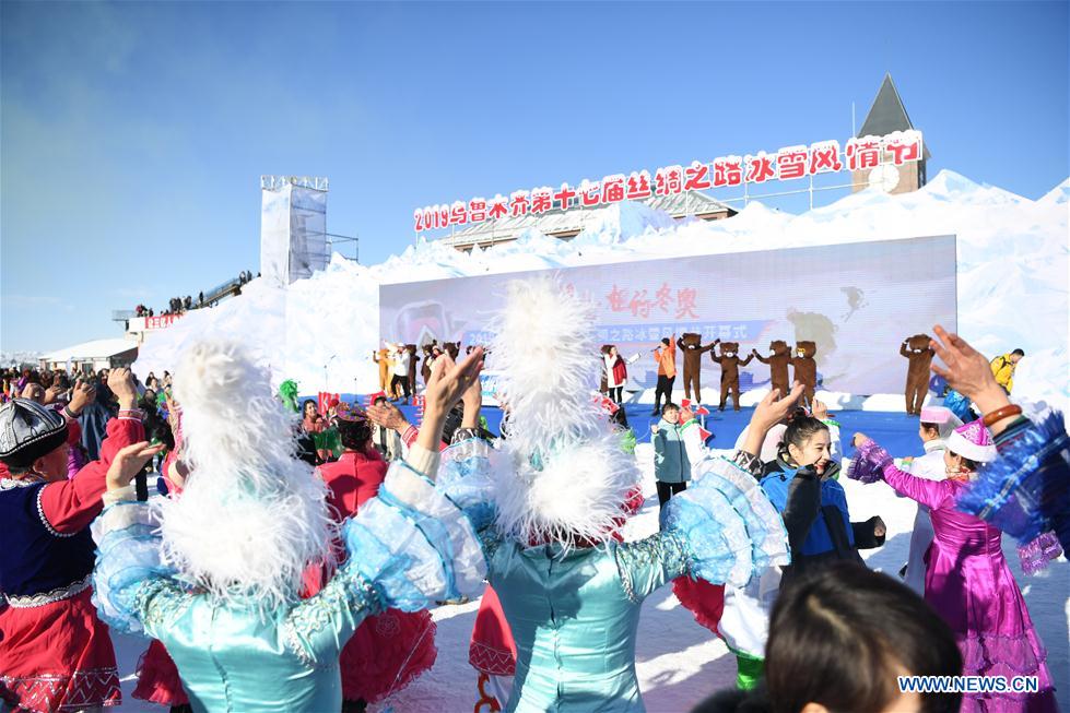 Performers dance during the opening ceremony of the Urumqi Silk Road Ice & Snow Festival in Urumqi, northwest China's Xinjiang Uygur Autonomous Region, Dec. 23, 2019. The 17th Urumqi Silk Road Ice & Snow Festival opened Monday in Urumqi, and will last till April of 2020. (Xinhua/Sadat)