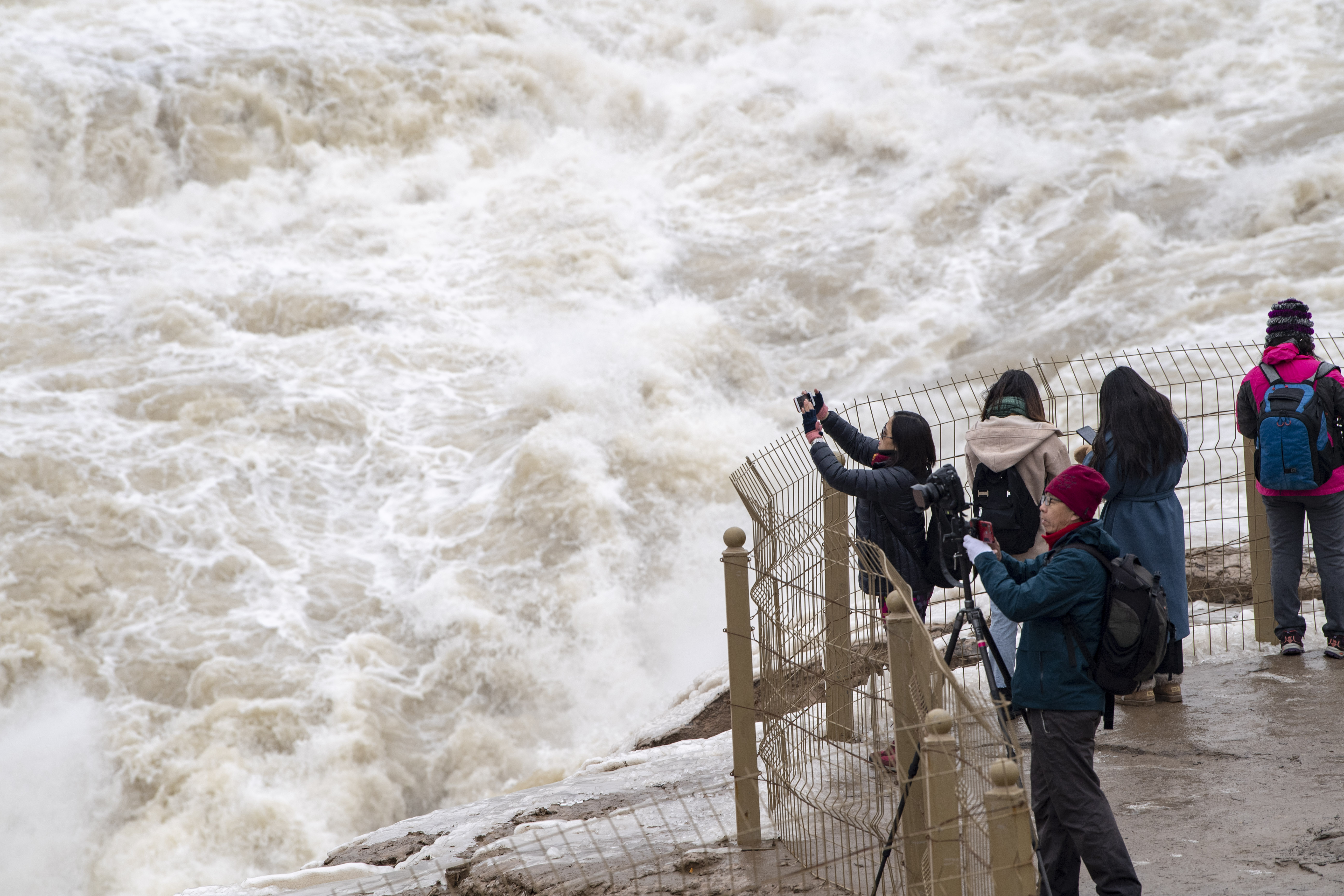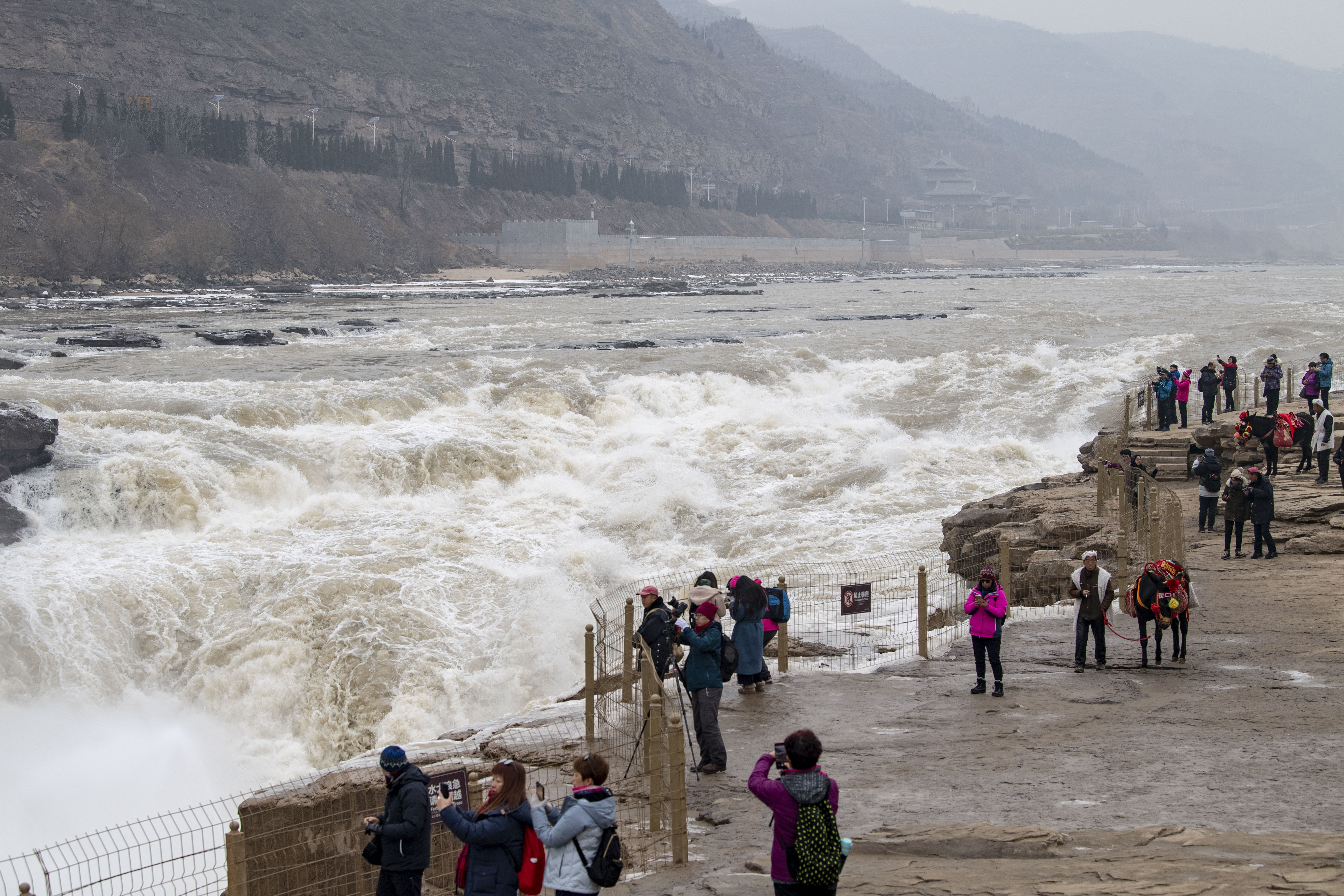 Tourists visit the Hukou Waterfall scenic spot in Jixian, north China's Shanxi Province, Dec. 24, 2019. Hukou waterfall is located on the border area between north China's Shanxi and northwest China's Shaanxi provinces. (Xinhua/Yang Chenguang)