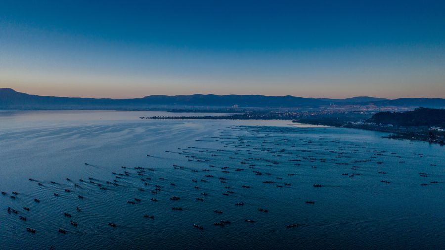 Aerial photo taken on Dec. 25, 2019 shows fishing boats sailing on the Xingyun Lake in Yuxi, southwest China's Yunnan Province. A fishing ban on the Xingyun Lake was lifted on Wednesday. The fishing season will last till Jan. 23, 2020. (Xinhua/Hu Chao)