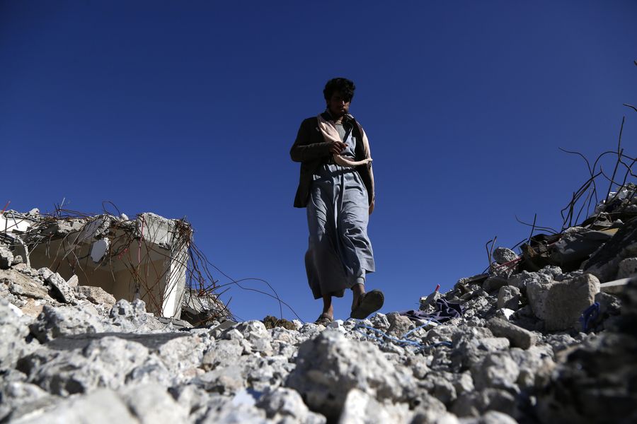 A man walks on rubble of building destroyed in airstrikes in Dhamar province, Yemen, Dec. 25, 2019. The ongoing fighting between the two warring rivals with daily Saudi-led airstrikes plunged Yemen into more chaos and violence. Three-quarters of the population, or more than 22 million people, urgently require some form of humanitarian assistance, including 8.4 million who struggle to find their next meal. (Photo by Mohammed Mohammed/Xinhua)