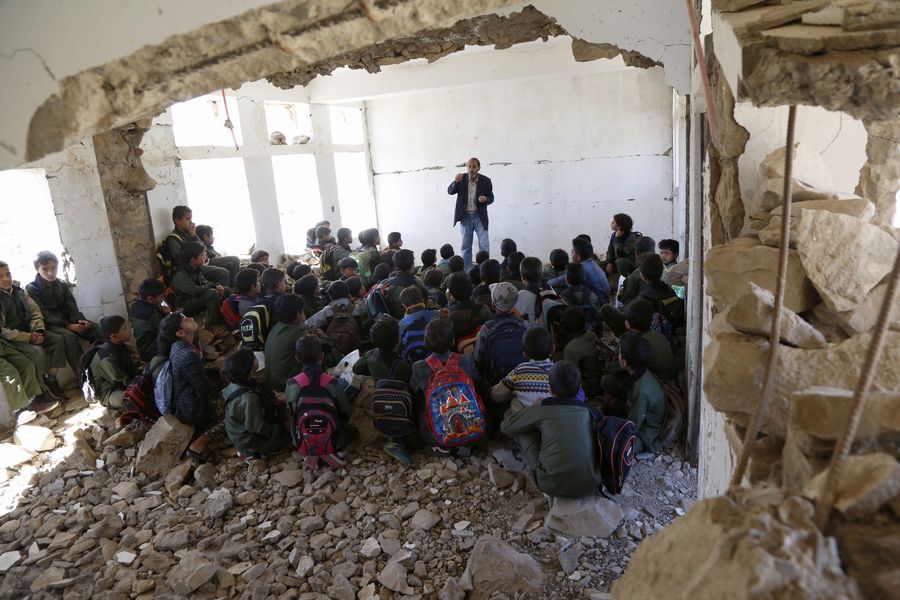 Students have a class in the Shuhada-Alwahdah School in Al-Radhmah district in Ibb province, Yemen, Dec. 23, 2019. The war in Yemen has forced more than two million children out of school and put 3.7 million others at high risk because of the non-payment of teachers' salaries, according to the United Nations Children's Fund (UNICEF). But for those who can return, they will risk everything in order to go back to the classrooms, even to sit on the rubble of airstrike-hit schools. (Photo by Mohammed Mohammed/Xinhua)