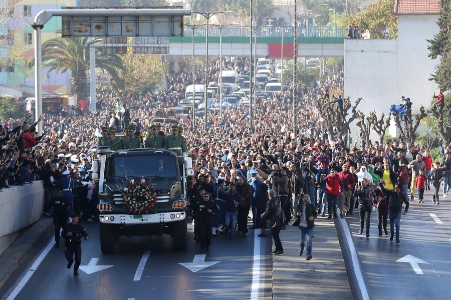 Algerian people bid farewell to late Army Chief Ahmed Gaid Salah in the streets of Algiers, Algeria, Dec. 25, 2019. Algeria on Wednesday buried late Army Chief Ahmed Gaid Salah in a military funeral. Tens of thousands of Algerians participated in the funeral while standing along the road from Algiers downtown to the El Alia cemetery, some 10 km eastern the capital. (Xinhua)
