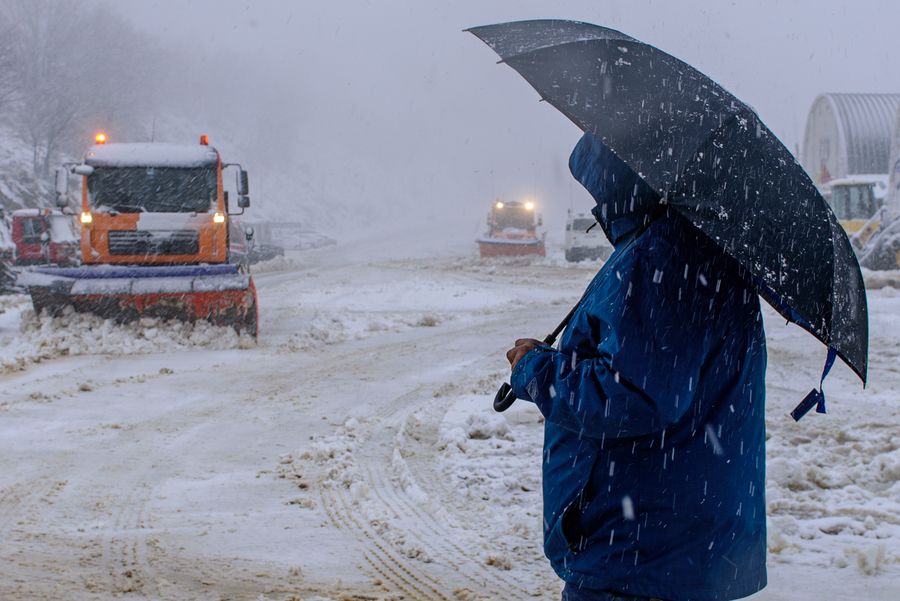 A man stands on the muddy snowy road in Mount Hermon in the Israeli-annexed Golan Heights as the first snowfall of the winter hit Golan Heights on Dec. 25, 2019. (Ayal Margolin/JINI via Xinhua)