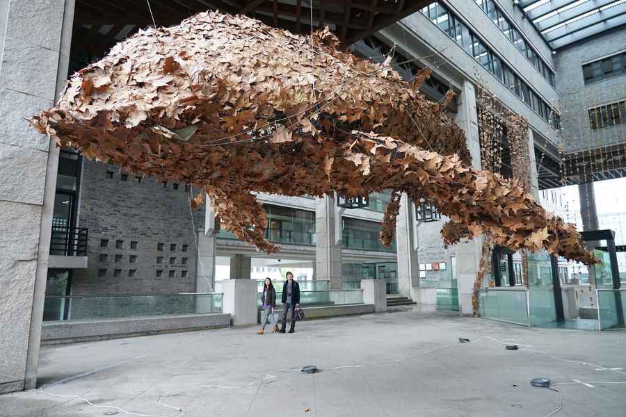 Local residents look at an artwork made of autumn leaves in an exhibition in Hangzhou, east China's Zhejiang Province, Dec. 24, 2019. The 3rd autumn leaves art exhibition opened here to present a visual feast for visitors. (Photo by Zhao Fanyu/Xinhua)■