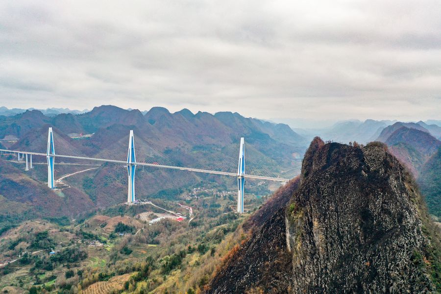 Aerial photo taken on Dec. 29, 2019 shows a view of the Pingtang Bridge in southwest China's Guizhou Province. (Xinhua/Liu Xu)