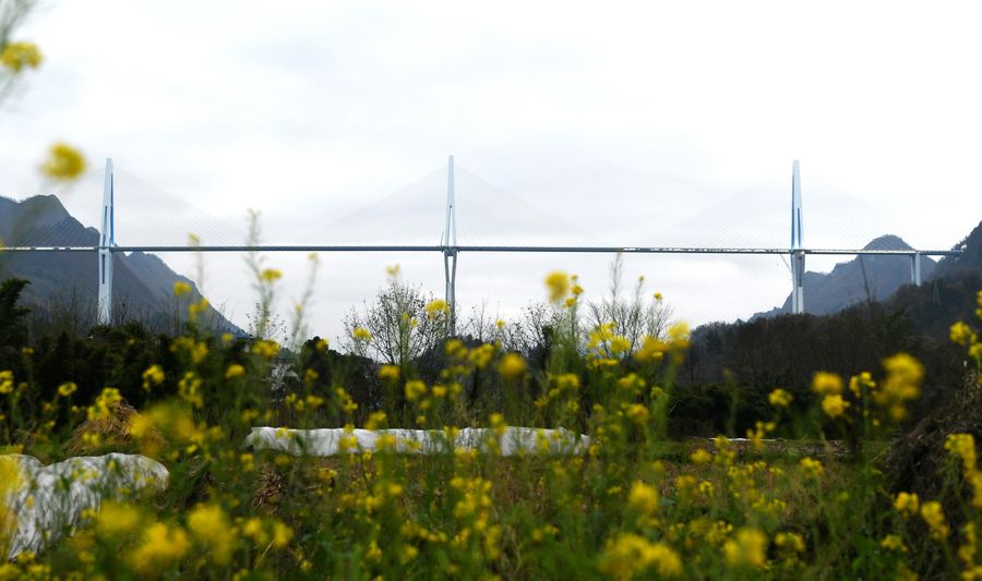 A colossal cable-supported viaduct that spans 2,135 meters across a canyon in southwest China opens to traffic on Monday. As tall as a 110-floor building, the main tower in the middle of the bridge features the world's tallest reinforced concrete bridge tower.
