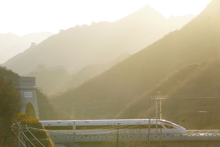 The G2418 high-speed train runs on the Juyongguan Pass section of the Beijing-Zhangjiakou high-speed railway line in Beijing, capital of China, Dec. 30, 2019. (Xinhua/Xing Guangli)