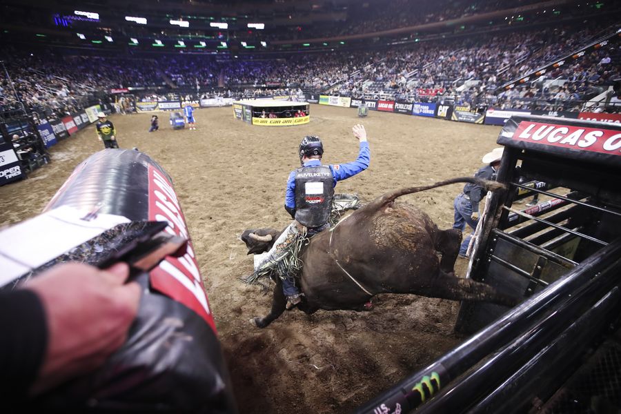 Dakota Buttar rides on bull Twinkle Toes on the first day of the Professional Bull Riders (PBR) Unleash the Beast bull riding event in New York, the United States, Jan. 3, 2020. (Xinhua/Wang Ying)