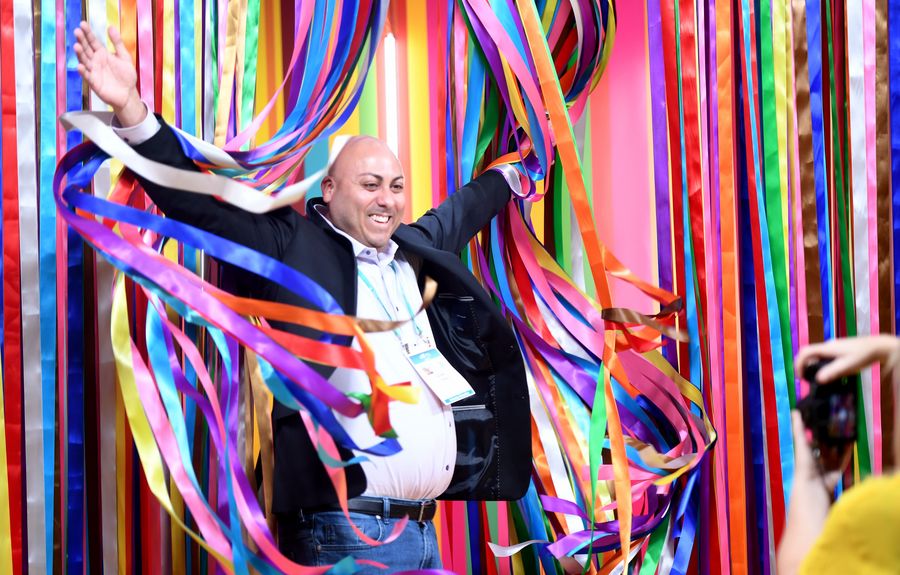A man poses for photos during the 2020 Consumer Electronics Show (CES) in Las Vegas, the United States, Jan. 7, 2020. (Xinhua/Wu Xiaoling)