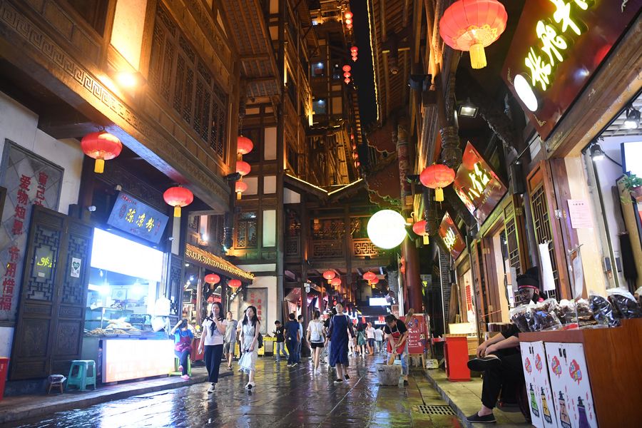 Visitors are seen in Hongyadong scenic spot at night in Yuzhong District, southwest China's Chongqing Municipality, Sept. 9, 2019. (Xinhua/Tang Yi)