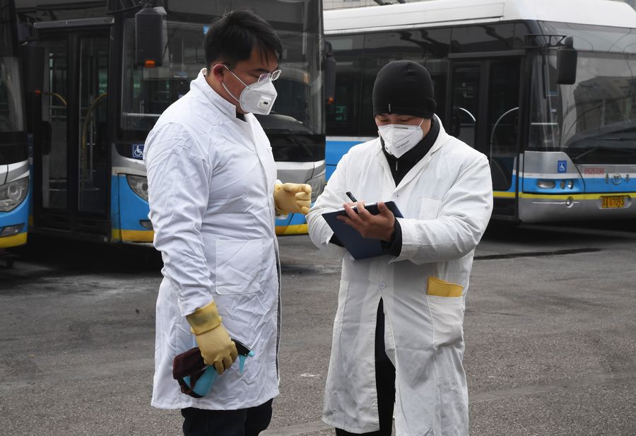 Staff members record a disinfection log at a bus station in Beijing, capital of China, Jan. 27, 2020. (Xinhua/Ren Chao)