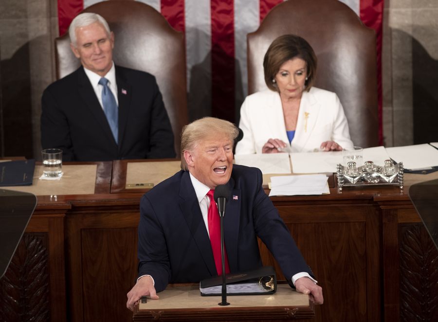 U.S. President Donald Trump delivers his State of the Union address to a joint session of Congress on Capitol Hill in Washington D.C., the United States, Feb. 4, 2020. (Xinhua/Liu Jie)