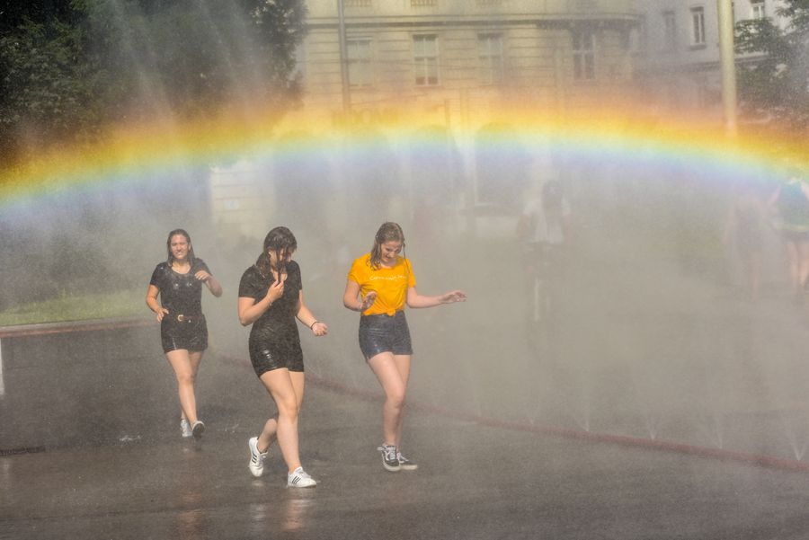 People cool off at the water spray on the Schwarzenberg Square in Vienna, Austria, on June 26, 2019. (Xinhua/Guo Chen)