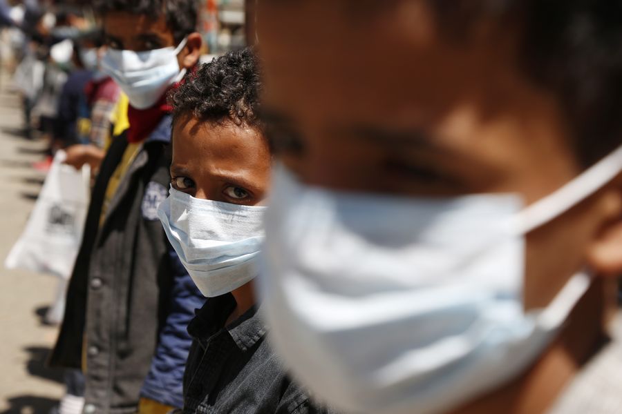 Orphans wear masks they received as an aid against the coronavirus in an orphan center in Sanaa, Yemen, March 23, 2020. (Photo by Mohammed Mohammed/Xinhua)