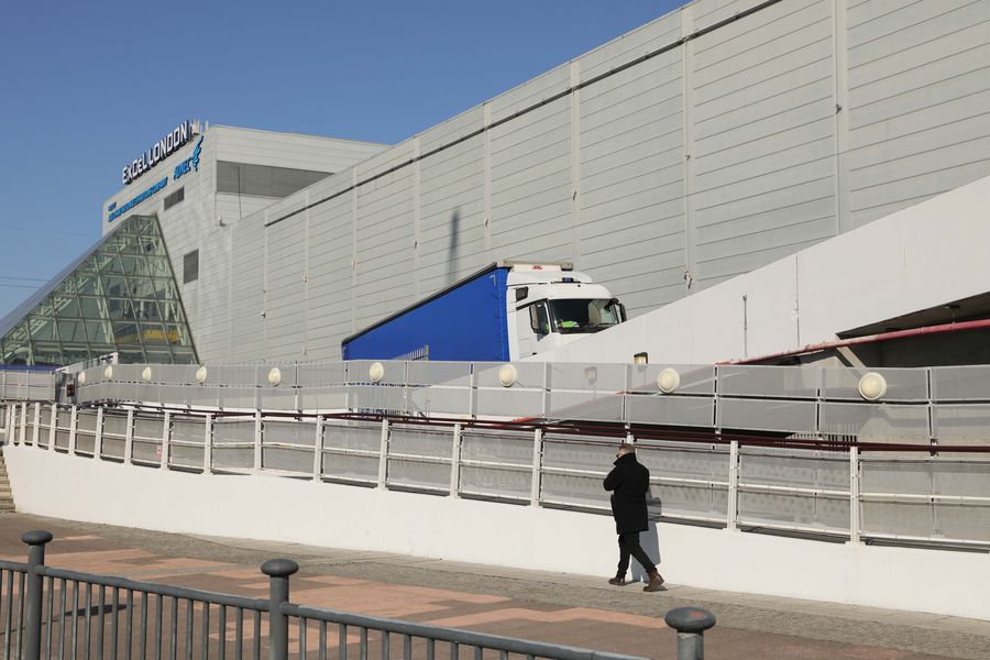 A lorry is seen outside the ExCel exhibition centre in London, Britain, March 25, 2020. (Photo by Tim Ireland/Xinhua)
