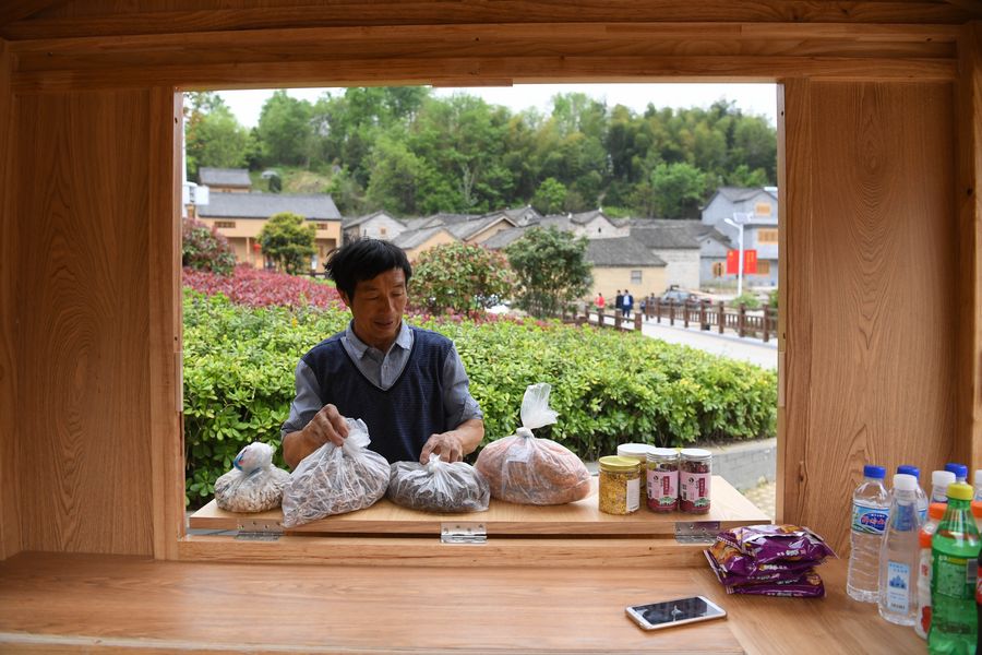 A villager arranges local specialties for sale at Dawan Village of Jinzhai County, east China's Anhui Province, April 17, 2020. (Xinhua/Liu Junxi)
