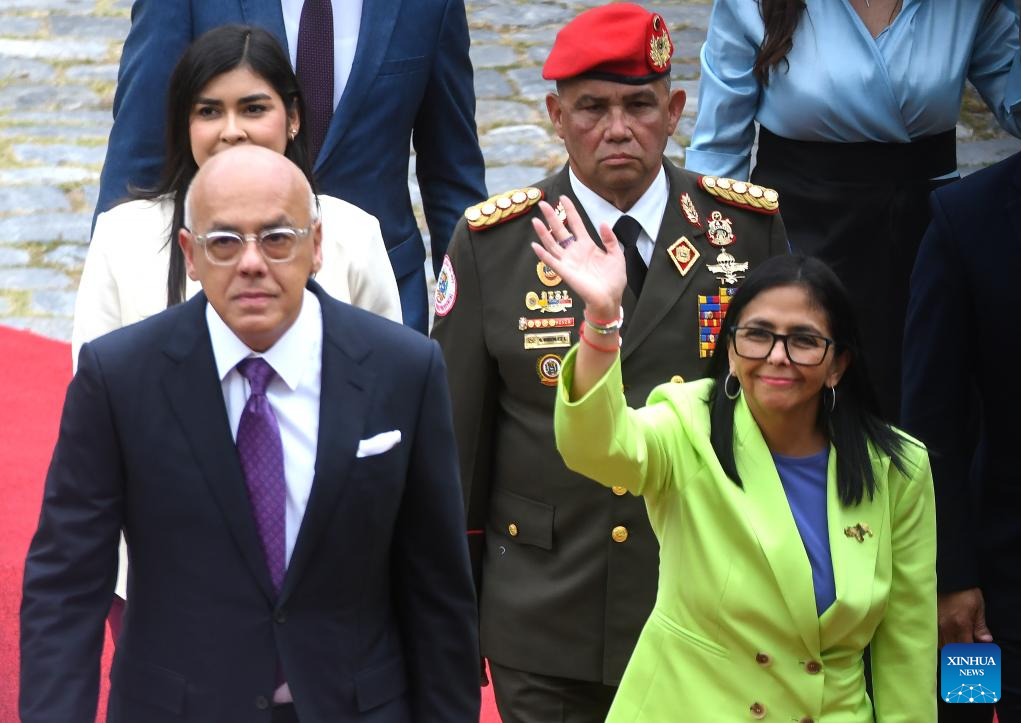 Venezuelan acting president Delcy Rodriguez (R) walks ahead of her annual report to the legislature on behalf of the administrative body in Caracas, Venezuela, Jan. 15, 2026. (Photo by Marco Salgado/Xinhua)