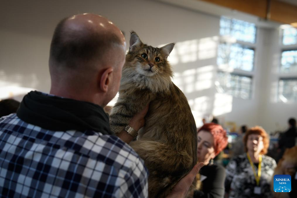 A breeder shows a Maine Coon cat during an international show of purebred cats in Warsaw, Poland, on Jan. 17, 2026. Around 200 cats of various breeds were showcased at the event organized by Poland's cat fanciers association SMK Jedynka. (Photo by Jaap Arriens/Xinhua)