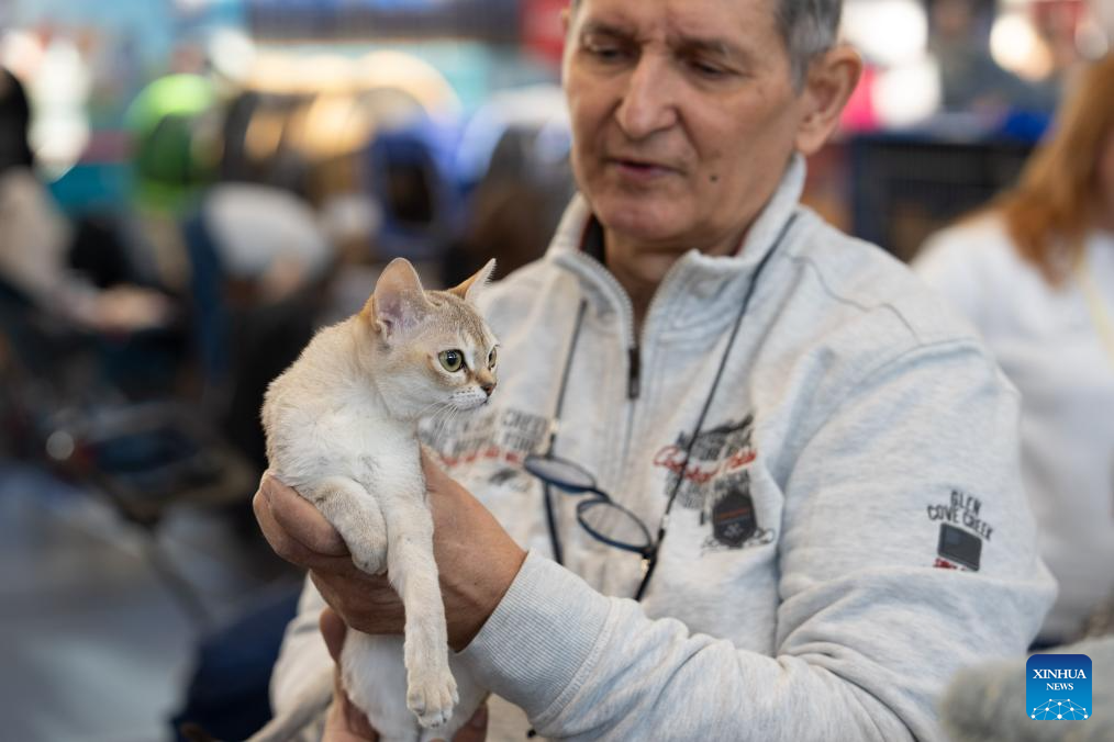 A breeder presents a Singapura cat during an international show of purebred cats in Warsaw, Poland, on Jan. 17, 2026. Around 200 cats of various breeds were showcased at the event organized by Poland's cat fanciers association SMK Jedynka. (Photo by Jaap Arriens/Xinhua)
