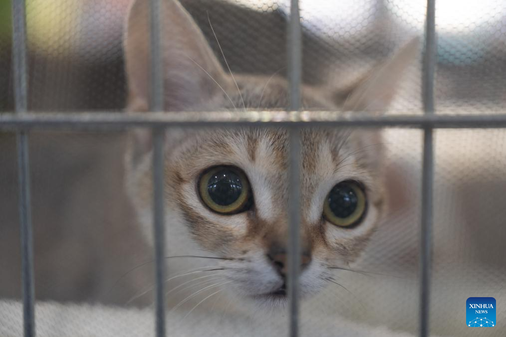 A Singapura cat looks out from its enclosure during an international show of purebred cats in Warsaw, Poland, on Jan. 17, 2026. Around 200 cats of various breeds were showcased at the event organized by Poland's cat fanciers association SMK Jedynka. (Photo by Jaap Arriens/Xinhua)