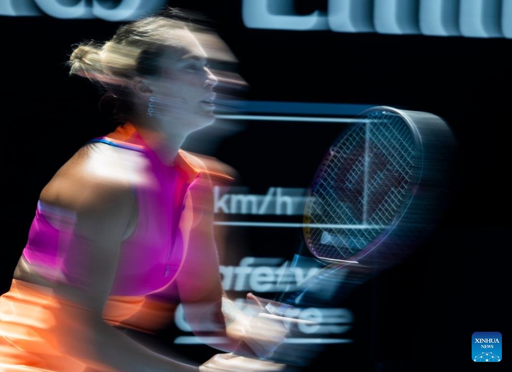 Aryna Sabalenka of Belarus hits a return during the women's singles 2nd round match against Bai Zhuoxuan of China at the Australian Open tennis tournament in Melbourne, Australia, Jan. 21, 2026. (Xinhua/Ma Ping)