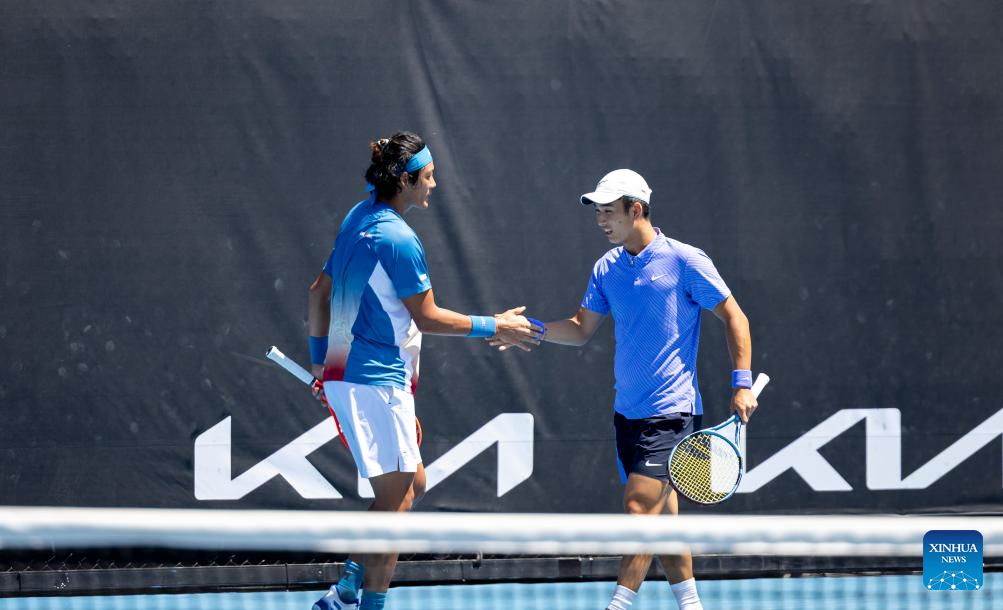 Zhang Zhizhen/Shang Juncheng (R) of China react during the men's doubles 1st round match against Rajeev Ram of the United States/Matthew Ebden of Australia at the Australian Open tennis tournament in Melbourne, Australia, Jan. 21, 2026. (Photo by Hu Jingchen/Xinhua)