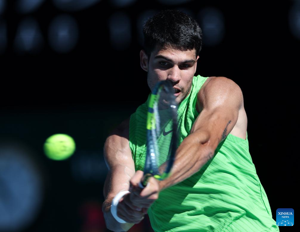 Carlos Alcaraz of Spain hits a return during the men's singles 2nd round match against Yannick Hanfmann of Germany at the Australian Open tennis tournament in Melbourne, Australia, Jan. 21, 2026. (Xinhua/Ma Ping)