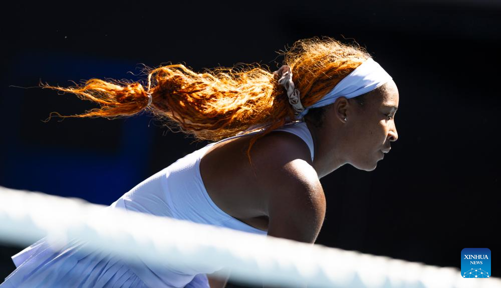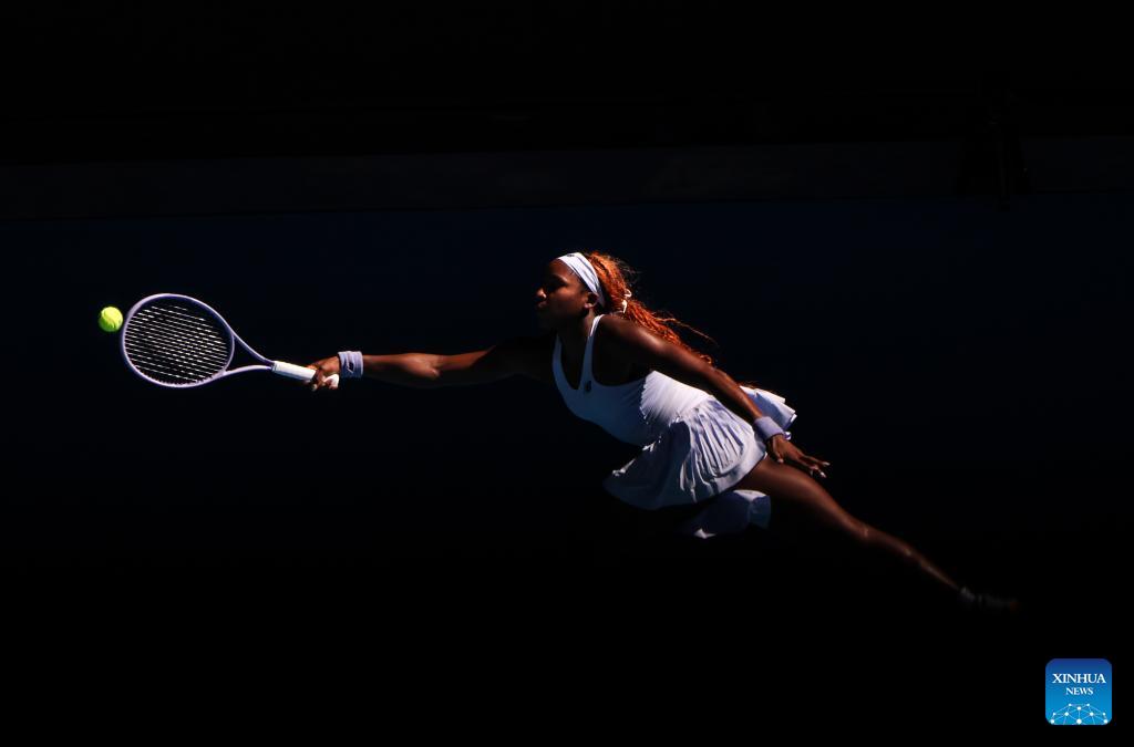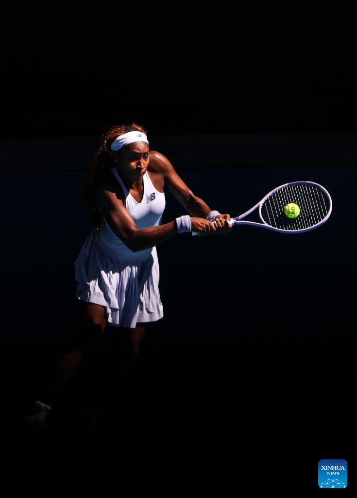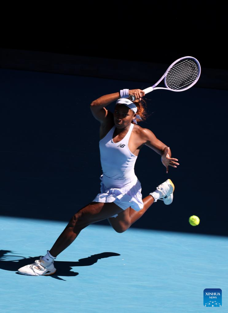 Coco Gauff of the United States hits a return during the women's singles 2nd round match against Olga Danilovic of Serbia at the Australian Open tennis tournament in Melbourne, Australia, Jan. 21, 2026. (Xinhua/Ma Ping)