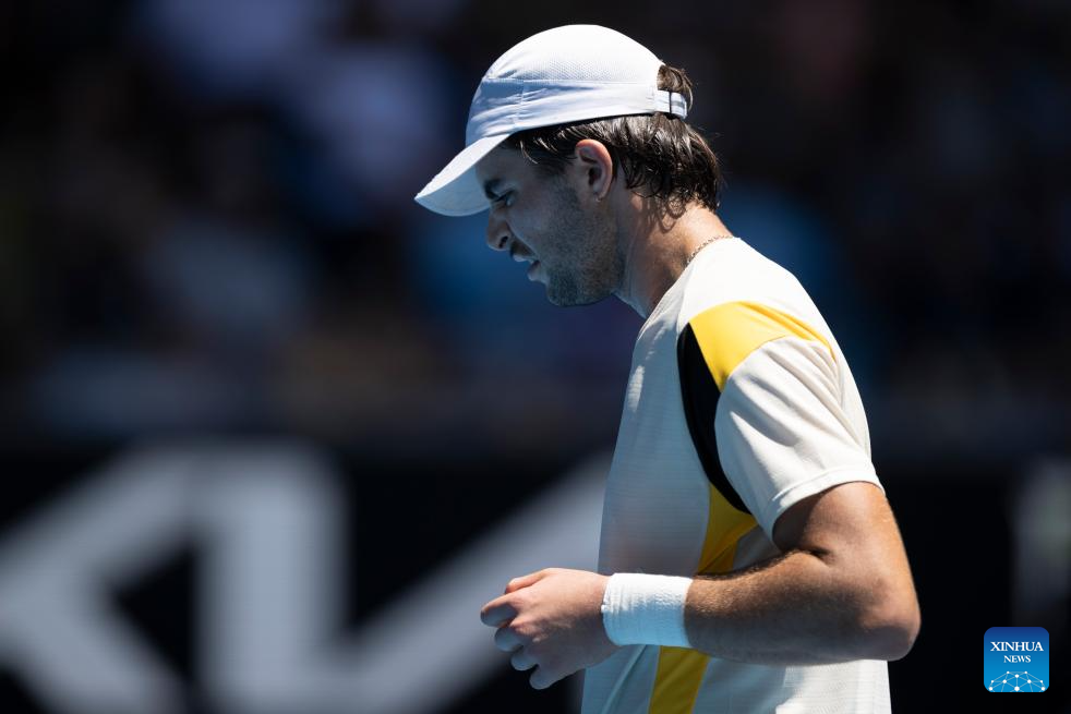 Jaime Faria of Portugal reacts during the men's singles 2nd round match against Andrey Rublev of Russia at the Australian Open tennis tournament in Melbourne, Australia, Jan. 21, 2026 (Photo by Hu Jingchen/Xinhua)