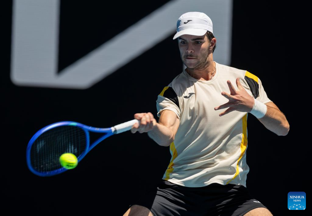 Jaime Faria of Portugal hits a return during the men's singles 2nd round match against Andrey Rublev of Russia at the Australian Open tennis tournament in Melbourne, Australia, Jan. 21, 2026 (Photo by Hu Jingchen/Xinhua)