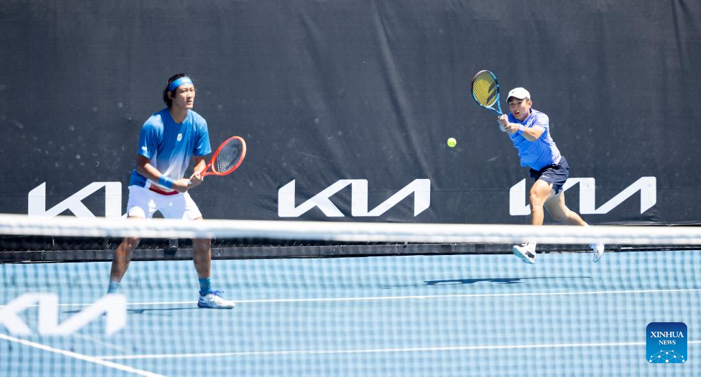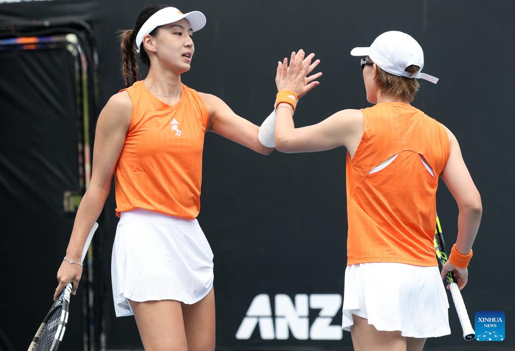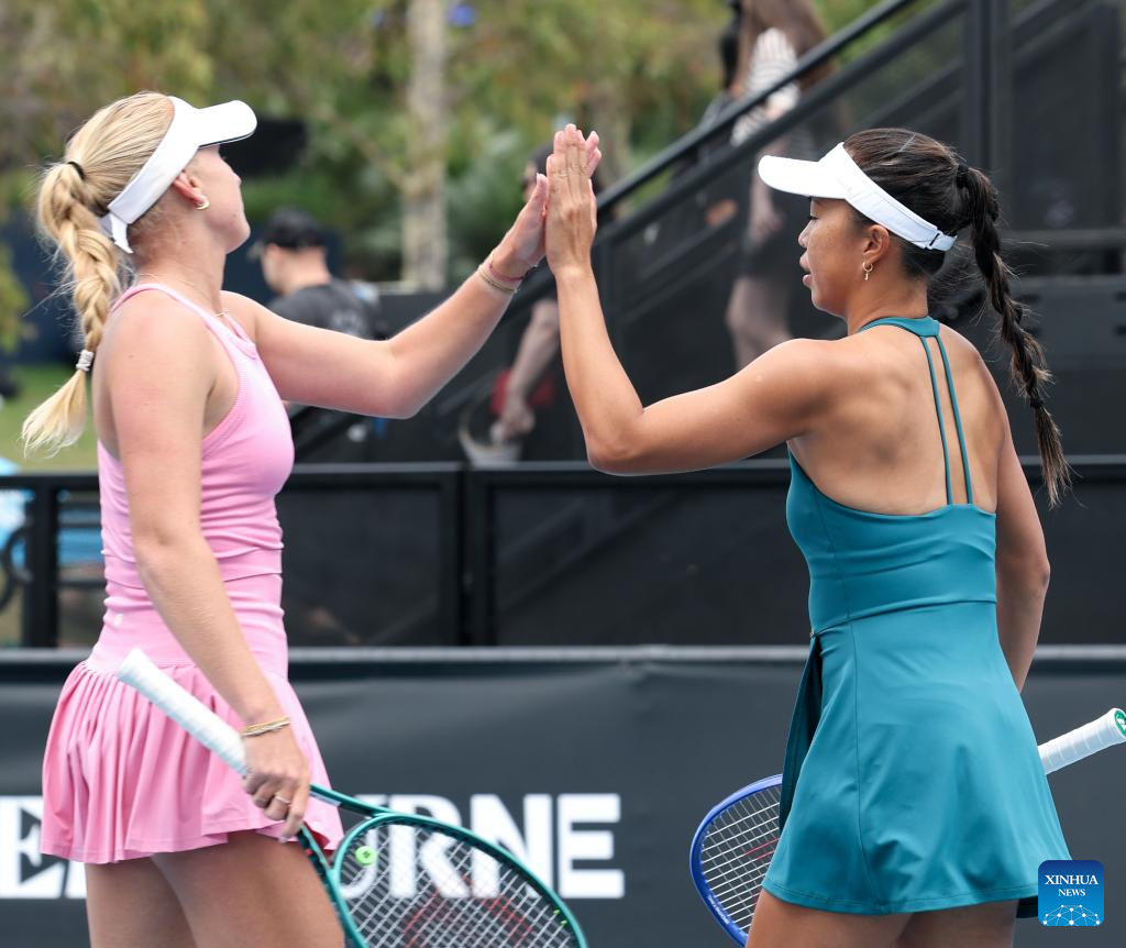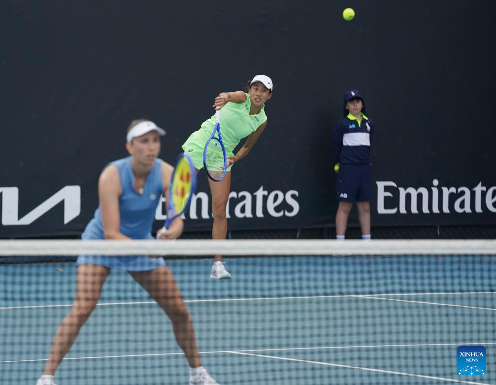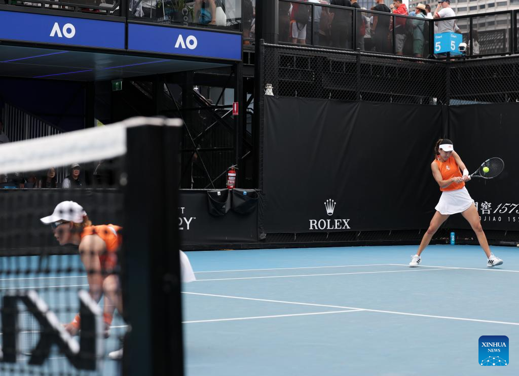 Wang Xinyu(R)/Zheng Saisai of China compete during the women's doubles 1st round match against Taylah Preston/Lizette Cabrera of Australia at the Australian Open tennis tournament in Melbourne, Australia, Jan. 21, 2026. (Xinhua/Ma Ping)