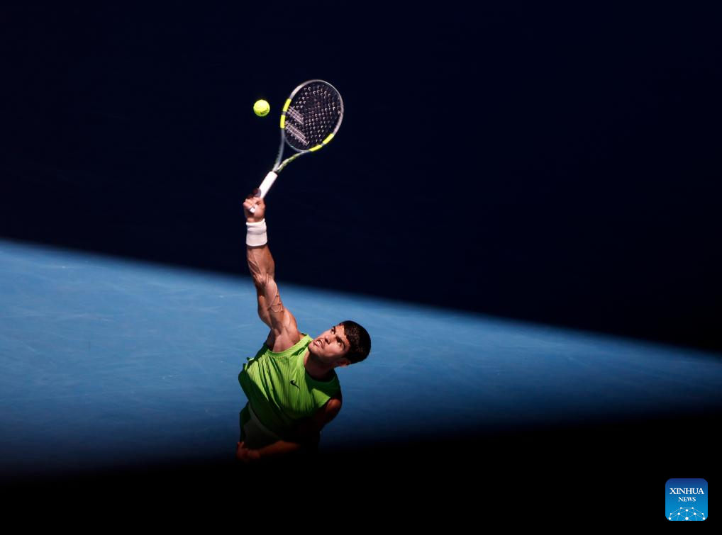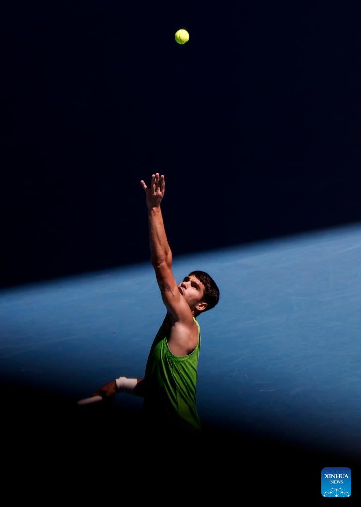 Carlos Alcaraz of Spain serves during the men's singles 2nd round match against Yannick Hanfmann of Germany at the Australian Open tennis tournament in Melbourne, Australia, Jan. 21, 2026. (Xinhua/Ma Ping)